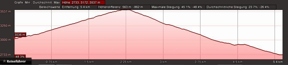 (auf) 250hm, (ab) 2900hm, 13,0km, 5:30h (incl. Ausflug zum Rand des Reuschkraters, rund 1h und 100hm auf und ab)